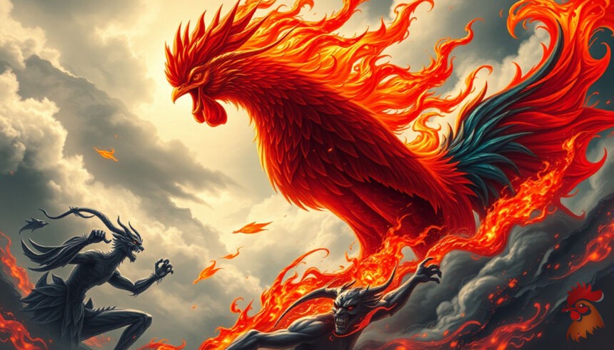 Давай перейдем к самому вкусному — конкретным легендам. Одна из самых крутых историй — это про Петуха-Хранителя Небесного Огня. Говорят, что давным-давно, когда мир еще был молодым, демоны украли солнце, и земля погрузилась во тьму. Люди молились богам, но те молчали. И тогда появился огромный петух с огненными перьями. Он взлетел на небо, вступил в бой с демонами и своим криком вернул солнце на место. С тех пор его потомки — обычные петухи — каждое утро напоминают нам о той победе.